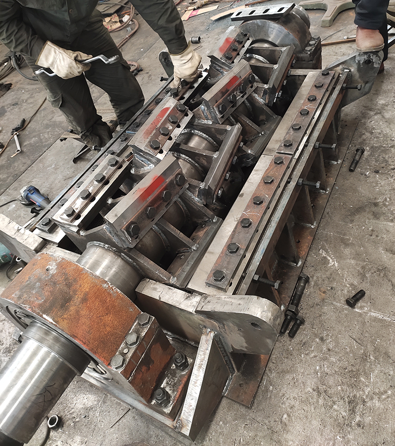該機主廂體有雙層鋼板焊接而成,隔層加立焊加強筋,提高了主廂體的抗衝擊抗疲勞能力,內嵌底刀使用更安全,拆卸更方便。可調式六刀主軸保證同心度的同時減小了主軸軸承軸承座的承載能力。下層廂體設計有雙側開合口,禁錮型活篩底根據料質不同隨時可以由開合口去除更換。